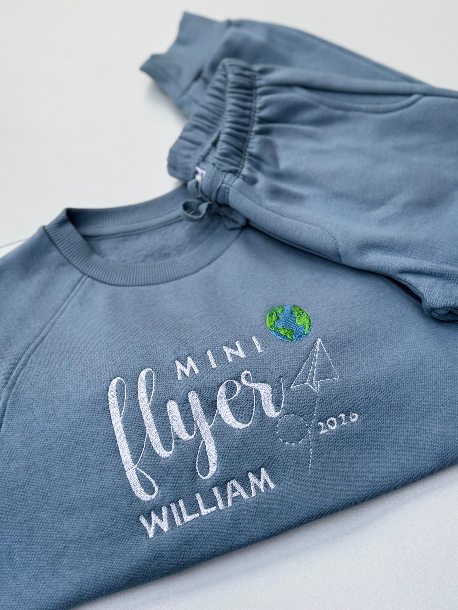 The sweatshirt features delicate embroidery with the child’s name, “Mini Flyer” wording, a sweet paper aeroplane and globe motif, finished with the year for an extra personal touch. Paired with matching joggers with a comfy elasticated waist, it’s perfect for lounging, playtime, or relaxed outings.
